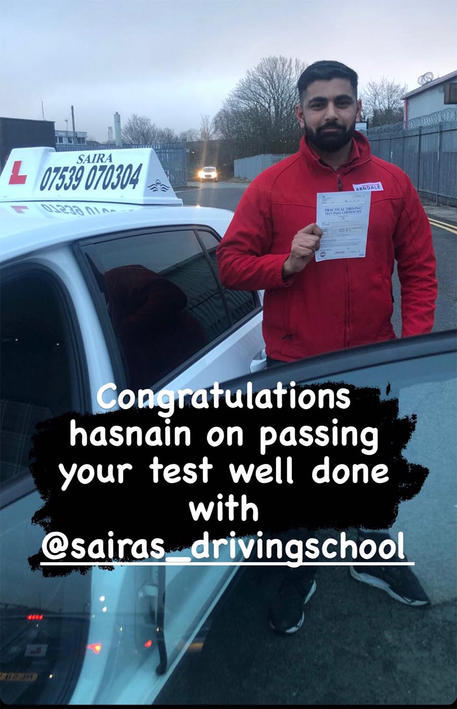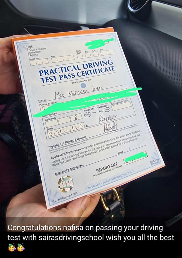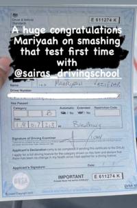 Thank you Saira. This wouldn't have happened without your lessons. Highly recommended driving school in Manchester.